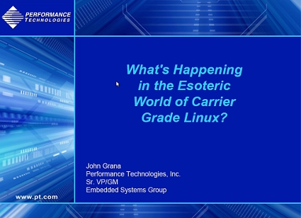 - John Grana, Senior VP and General Manager at Performance Technologies Inc. enlightened the audience regarding: “What’s Happening in the Esoteric World of Carrier Grade Linux?”