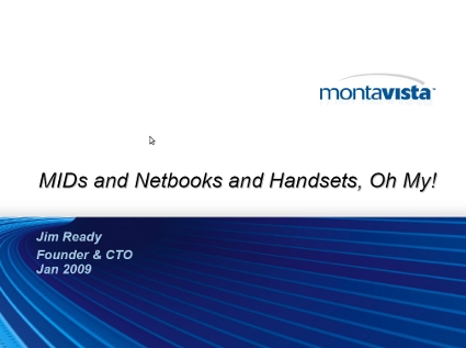 - Jim Ready, Founder and CTO at MontaVista Software spoke on: “MIDs and Netbooks and Handsets, Oh My!”