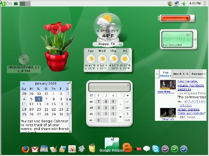 On arriving at gOS’s desktop for the first time, you’re greeted with a dizzying array of Vista-like desktop gadgets that open up applications within Mozilla Prism windows when clicked. This approach makes web-based applications — Google Mail, Google Calendar, and YouTube, for example — appear to be native Linux applications, rather than web pages embedded in a Firefox browser.