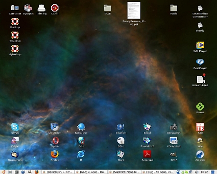Nice screenshot, you like to use single bottom panel, you enjoy skype, real-player, opera, firefox, excel, word, chromium, internet explorer and windows media player, next update try windows.