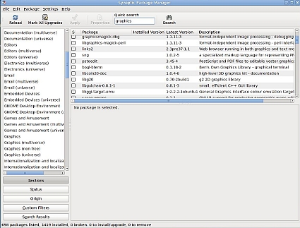 I like to do this using the apt-get utility from the command line. You might prefer using Synaptic, pictured below, a user-friendly tool that shows categories of software available and even provides popularity ratings for each program.