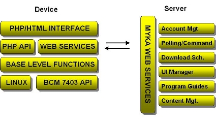 One interesting feature of Myka’s STB is that users can configure its content downloads remotely, via Myka’s website. This partitioned architecture (see diagram, below) makes the STB and its UI simpler and easier to use, claims Myka.
